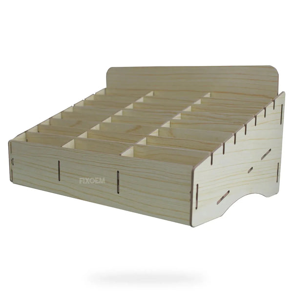 Práctico organizador para teléfonos celulares. Este producto tiene el ángulo indicado para una mayor comodidad y visibilidad de los teléfonos, se envia desarmado, requiere armado, fácil de armar, fabricado en MDF, contamos con organizadores de 24 y 48 espacios.