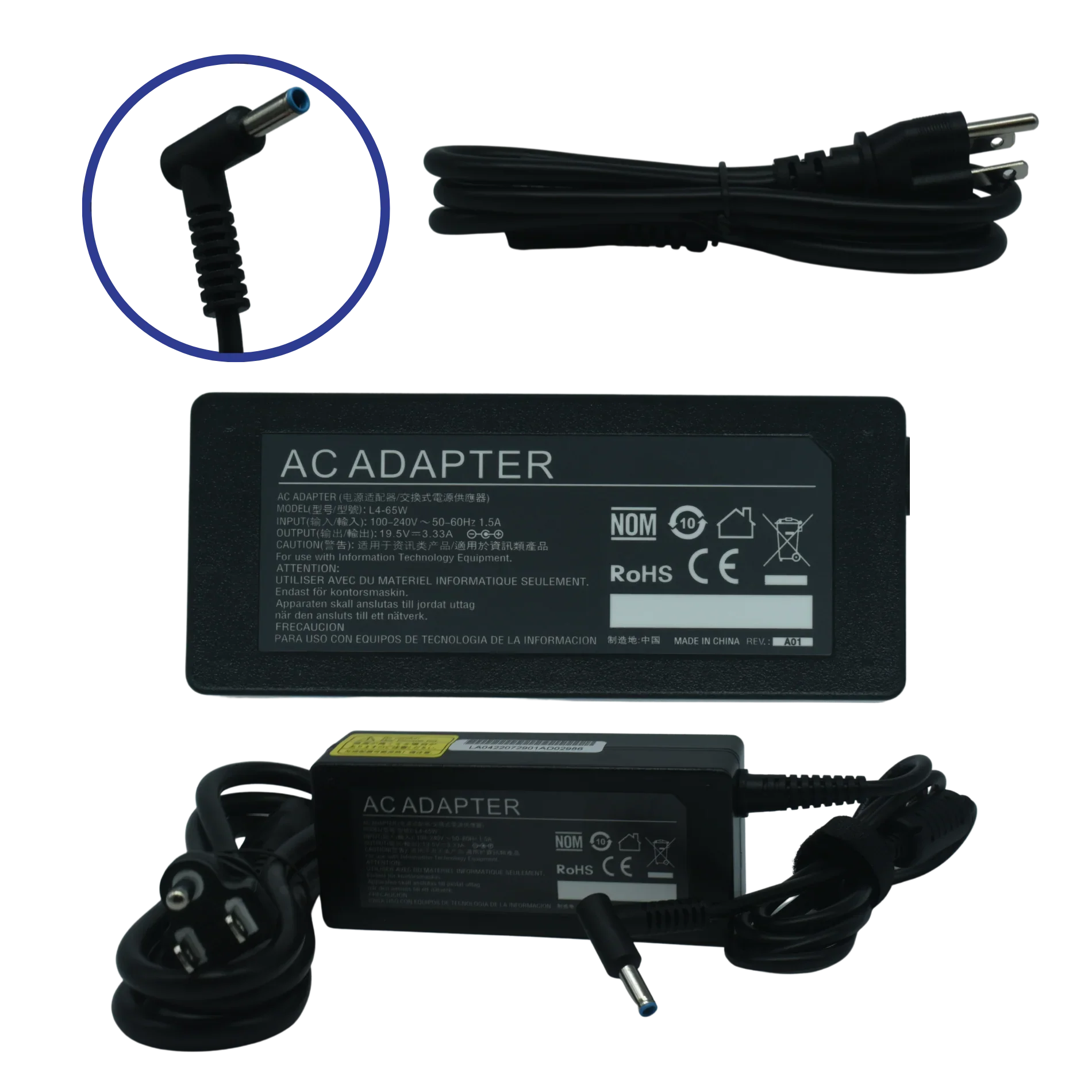 2. Propósito: suministro de energía para dispositivos que requieren 19.5V/3.33A (65W) y conector 4.5x3.0 mm